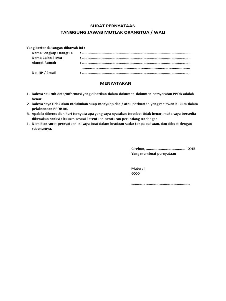 Silahkan download · klik untuk surat pernyataan mutlak orang tua calon peserta didik . Berikut ini adalah link download surat pernyataan pertanggung jawaban mutlak orang tua untuk kelengkapan berkas ppdb smk n 3 metro 2021. Sebagai orang tua kandung dari calon peserta didik baru (cpdb):. Surat pernyataan tanggungjawab mutlak orang tua. Surat pernyataan tanggung jawab mutlak orang tua/wali.